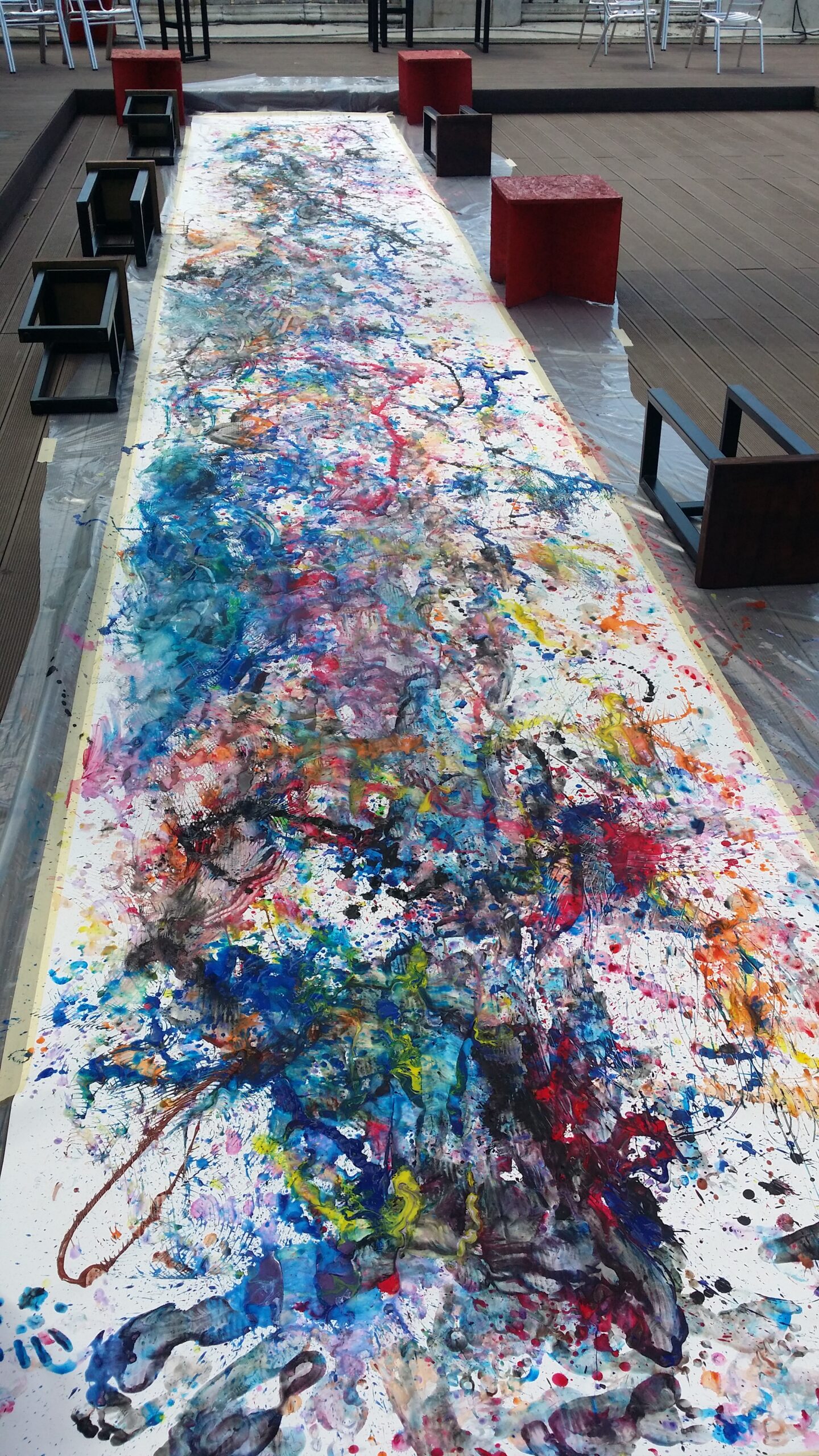 Mai întâi, în prima parte, coregrafia unei picturi, am prezentat copiilor participanți câteva picturi celebre în istoria artei, în genul compoziției figurative dinamice, cu mai multe personaje. Invitata modulului, Mia Iosif i-a încurajat și ajutat pe copii să ia posturile personajelor din imagini și să reproducă mișcarea acestora. În partea a doua a acestui modul, pictura unei coregrafii, am propus copiilor să întoarcă experimentul de oglindire a picturii în mișcare, realizând o coregrafie prin care să lase urme colorate.