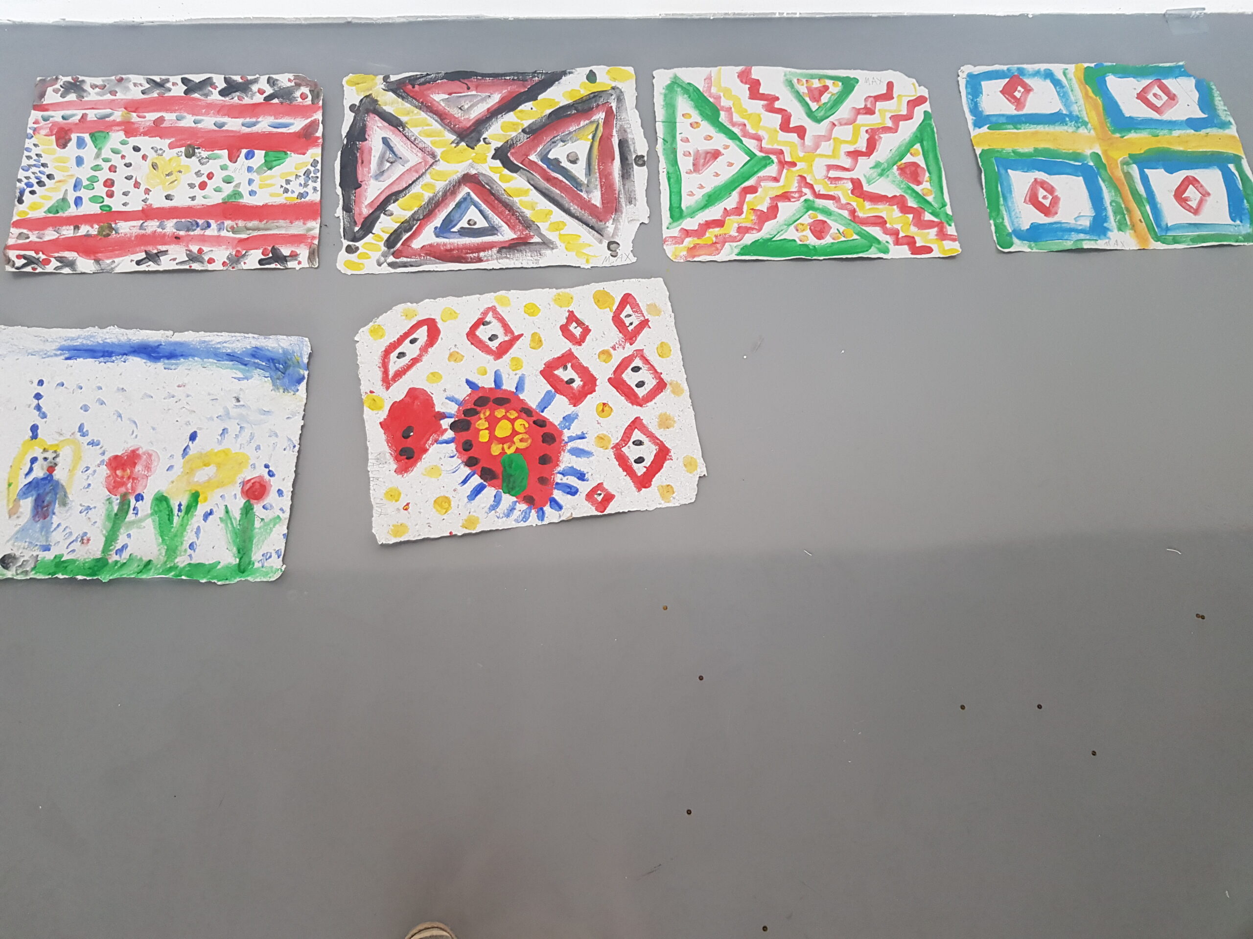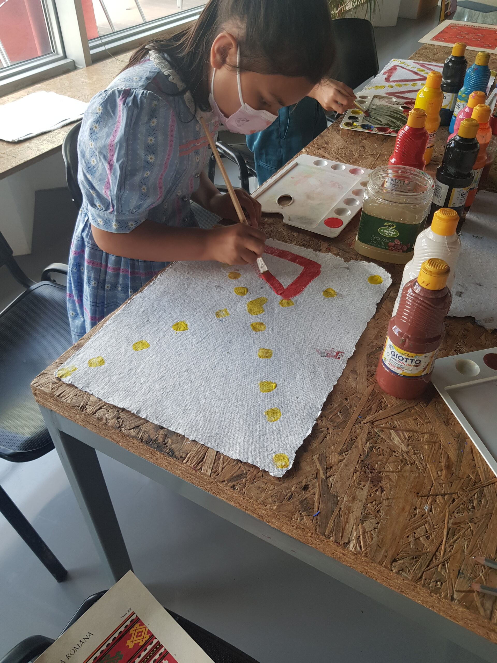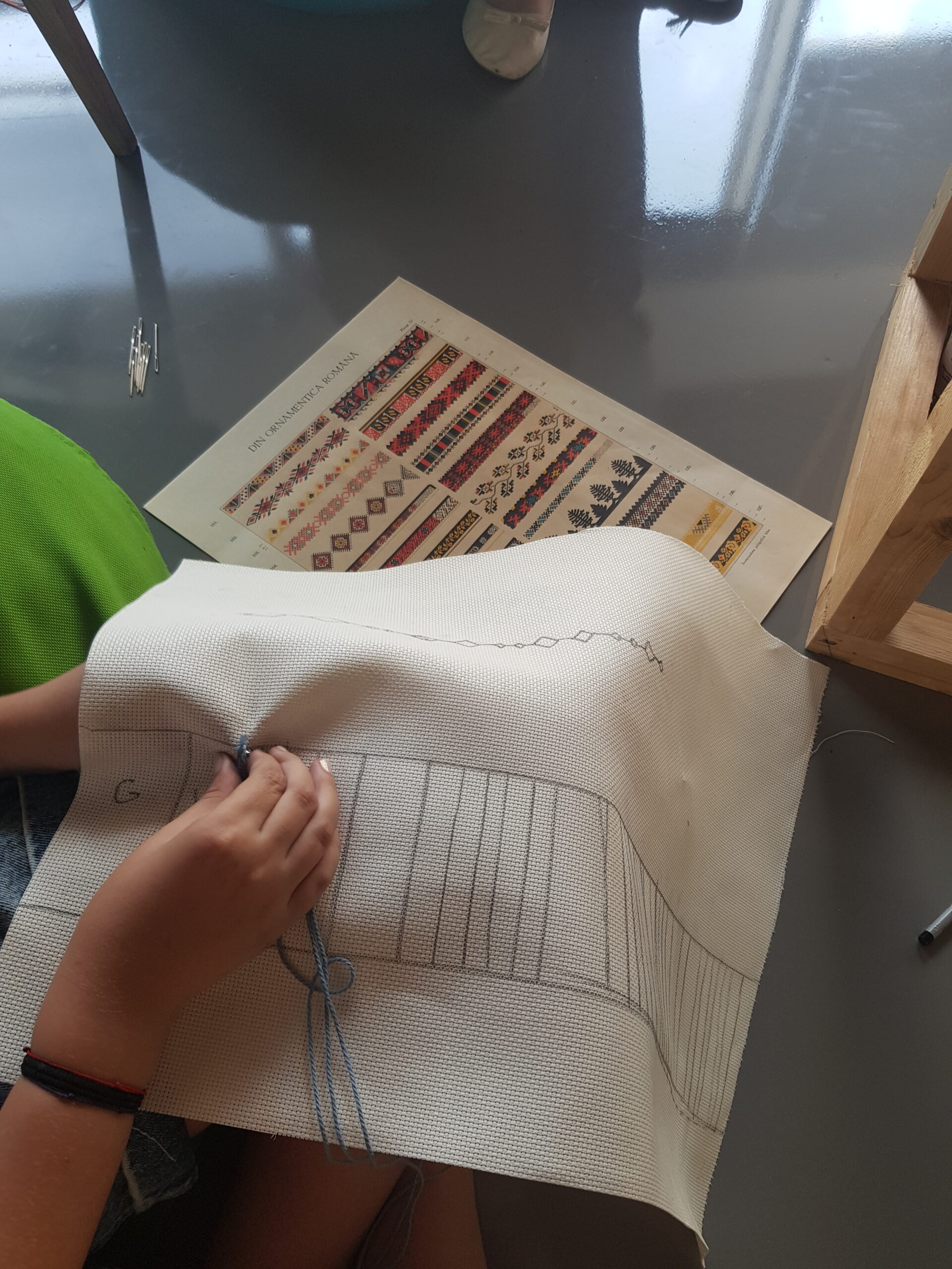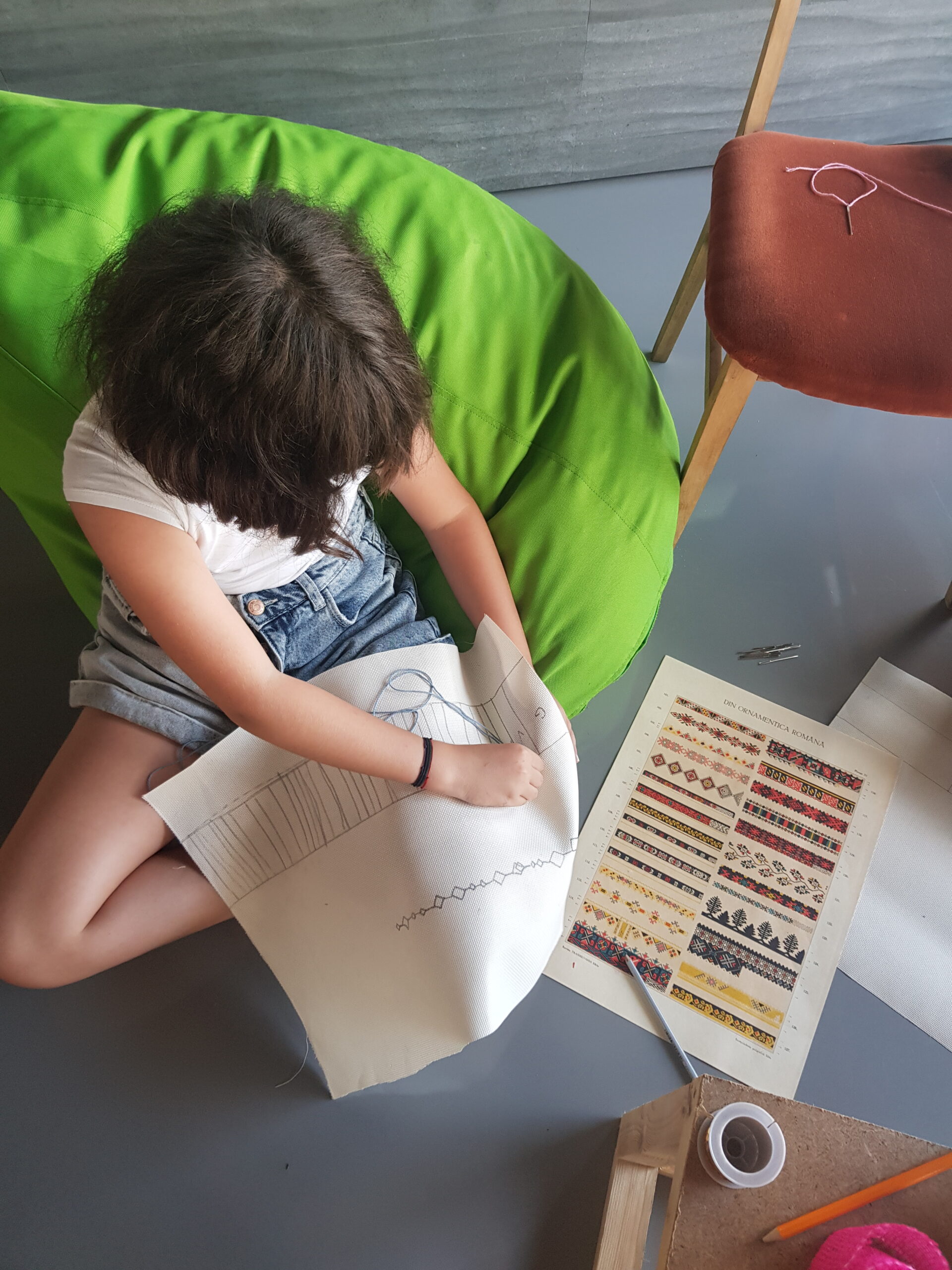 Împreună cu Lila Passima am creat o poveste vizuală a semnelor și simbolurilor specifice artei tărănești autohtone (tema atelierului fiind: despre semne și simboluri tradiționale românești), explicând pe înțelesul copiilor aceste simboluri și cum s-a ajuns la acestea cu ajutorul stilizării. În partea practică a atelierului, copiii au fost încurajați să picteze pe hârtie manuală și apoi să coasă pe bucăți de pânză, cu acul și fir de ață groasă, modele de pe ia românească sau să inventeze propriile semne stilizate. Copiii au fost foarte entuziaști față de lucrul manual și au dorit să continue cusutul acasă.