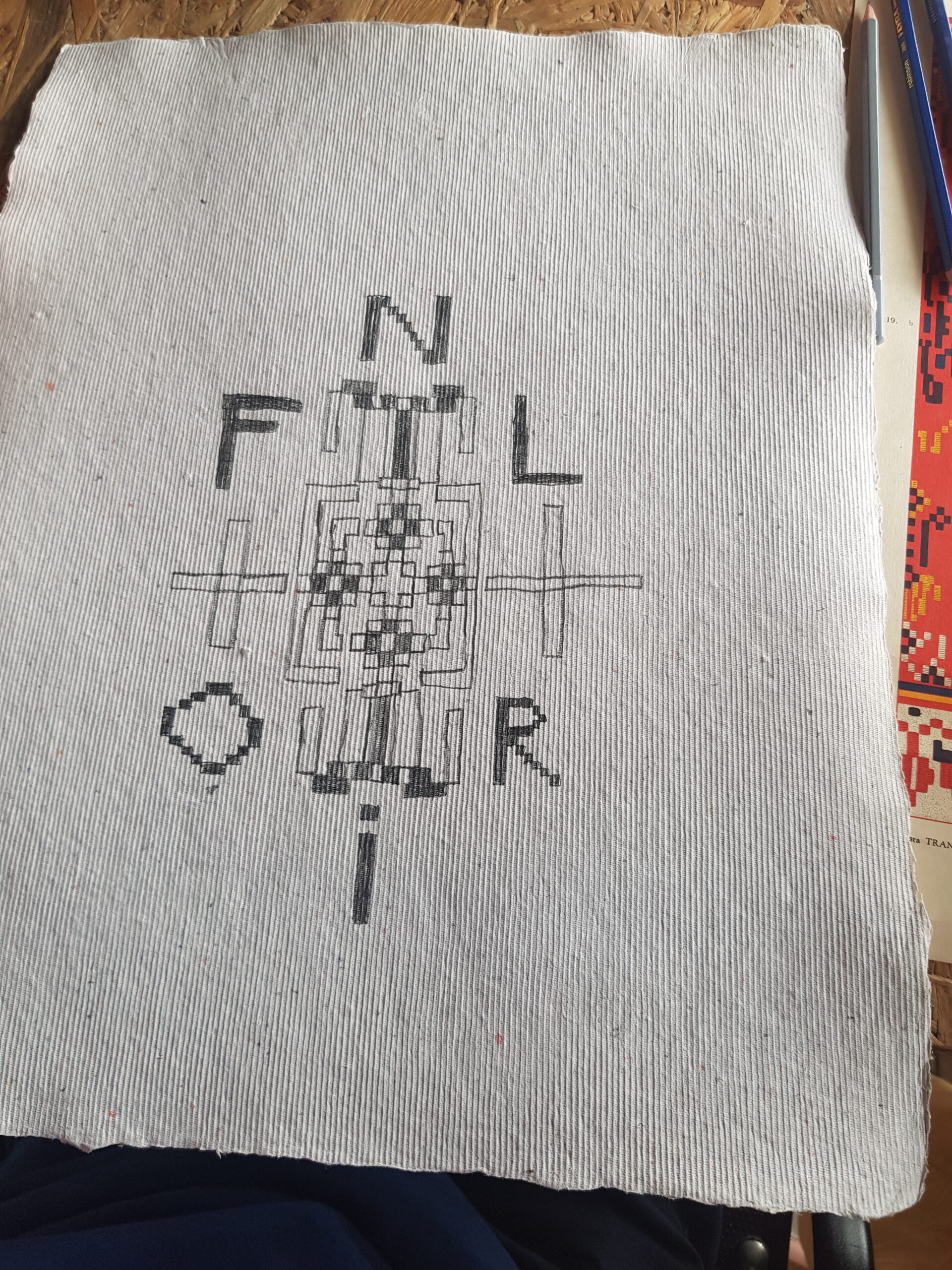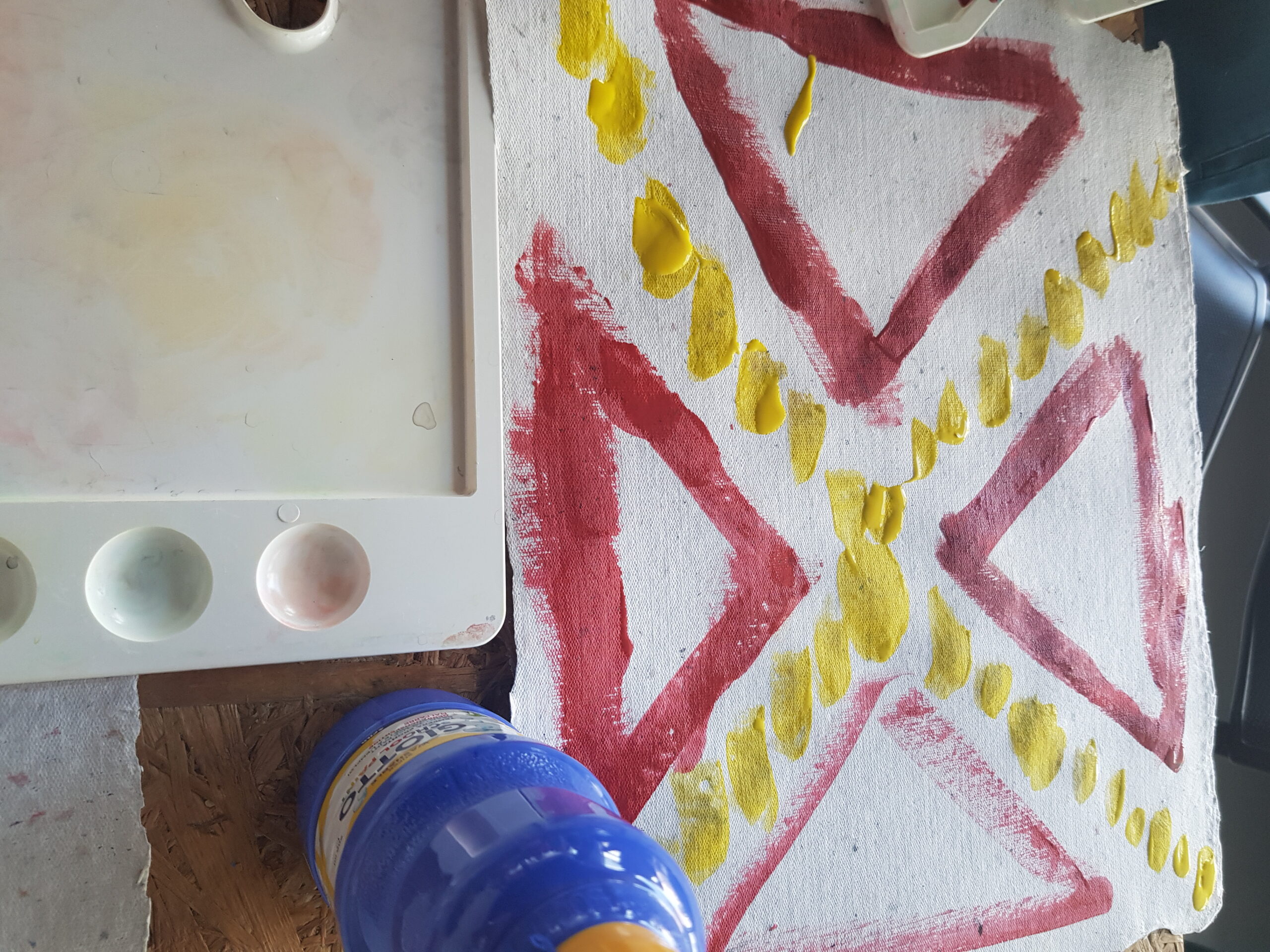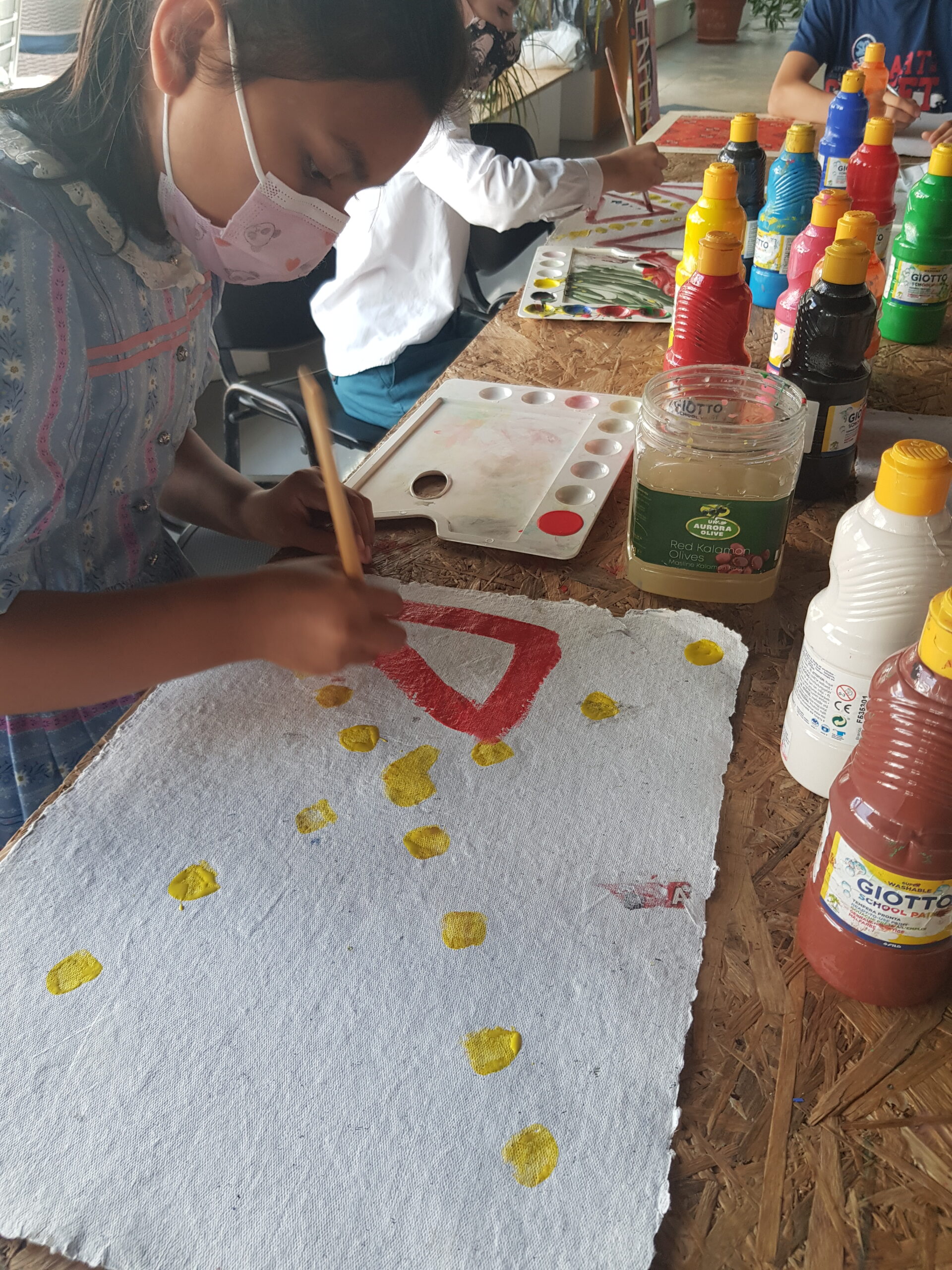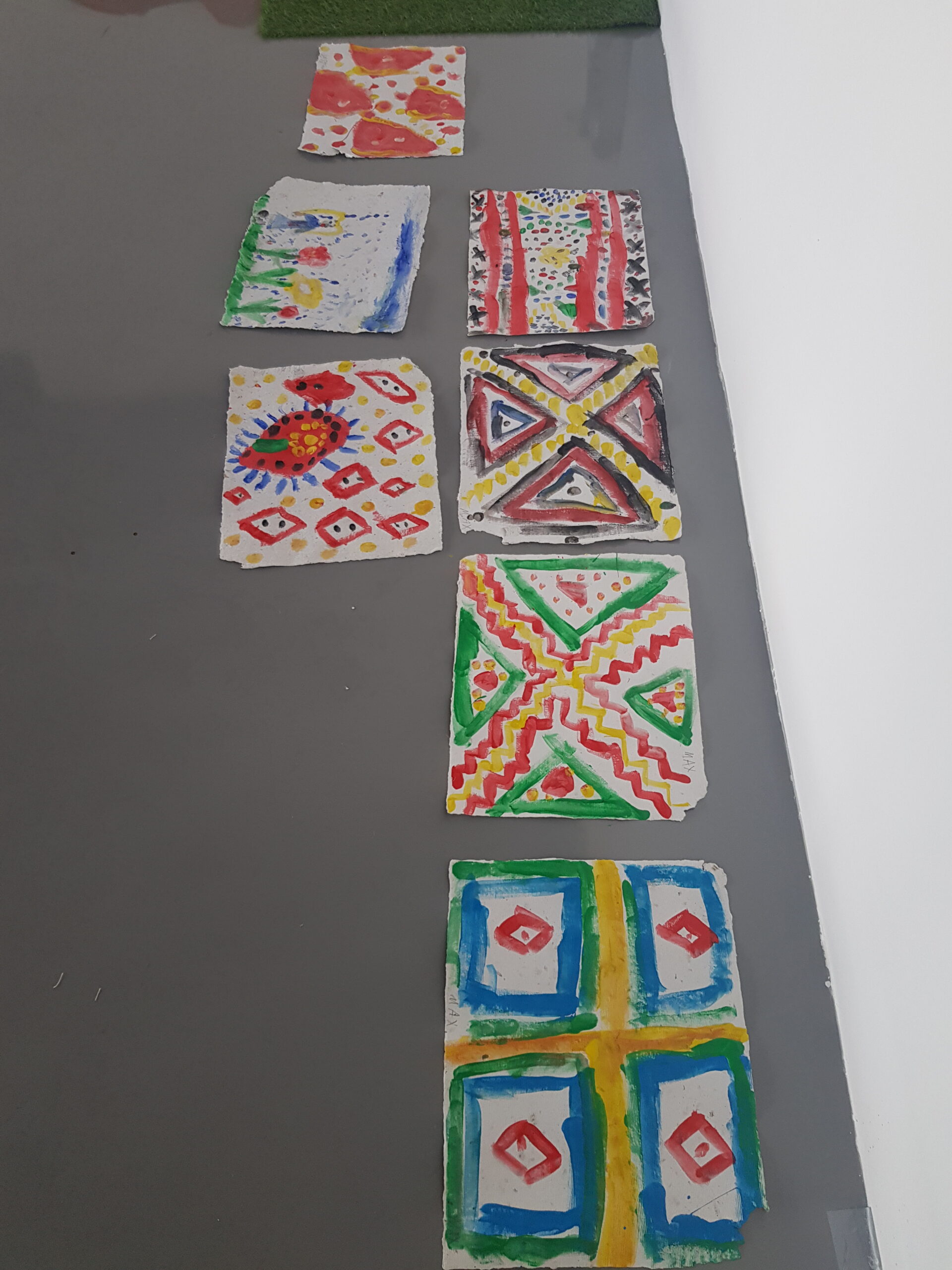 Împreună cu Lila Passima am creat o poveste vizuală a semnelor și simbolurilor specifice artei tărănești autohtone (tema atelierului fiind: despre semne și simboluri tradiționale românești), explicând pe înțelesul copiilor aceste simboluri și cum s-a ajuns la acestea cu ajutorul stilizării. În partea practică a atelierului, copiii au fost încurajați să picteze pe hârtie manuală și apoi să coasă pe bucăți de pânză, cu acul și fir de ață groasă, modele de pe ia românească sau să inventeze propriile semne stilizate. Copiii au fost foarte entuziaști față de lucrul manual și au dorit să continue cusutul acasă.